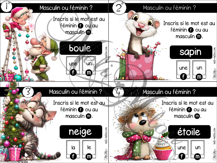30 cartes à tâches sur le thème de Noël où l’élève consolidera ses savoirs sur le genre des noms en inscrivant si le mot est masculin ou féminin.