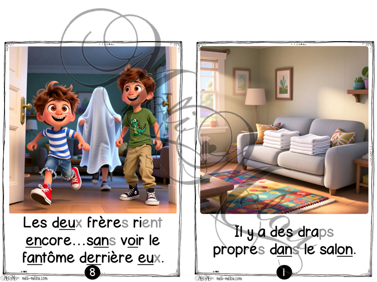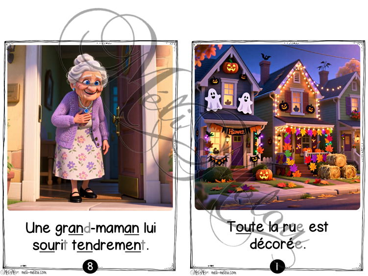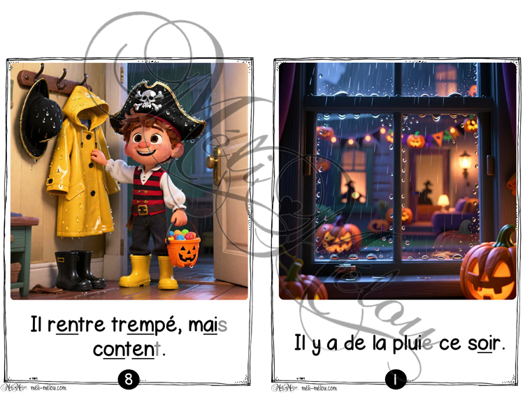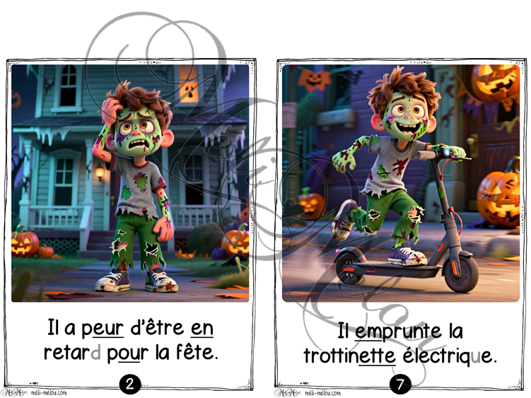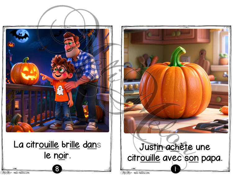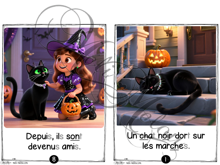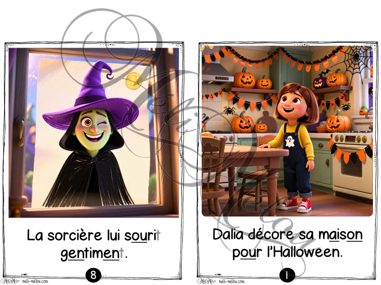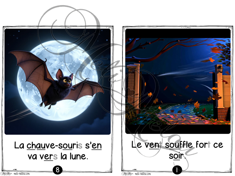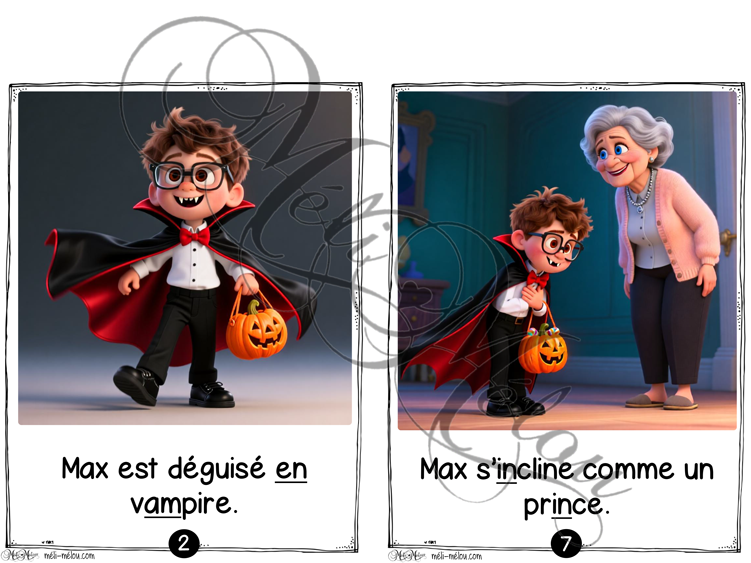 11 petits livrets de lecture de 8 pages sur le thème de l’Halloween pour lecteurs débutants. Les sons sont soulignés et les lettres muettes sont grisées. Au dos de chaque livret, il y a 3 questions de compréhension et une question de réaction.