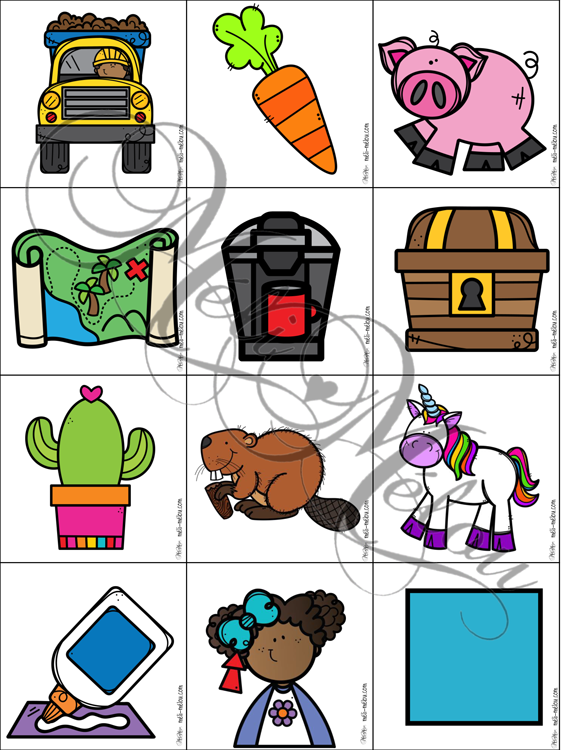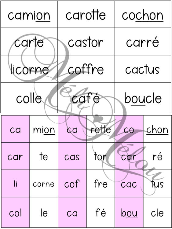 Découper les cartons des mots séparés en deux parties. Il est à noter que la première partie du mot est inscrite sur un carton coloré alors que la deuxième partie du mot se trouve sur un carton blanc. L’élève doit rassembler les deux parties du mot puis les associer à la bonne image.