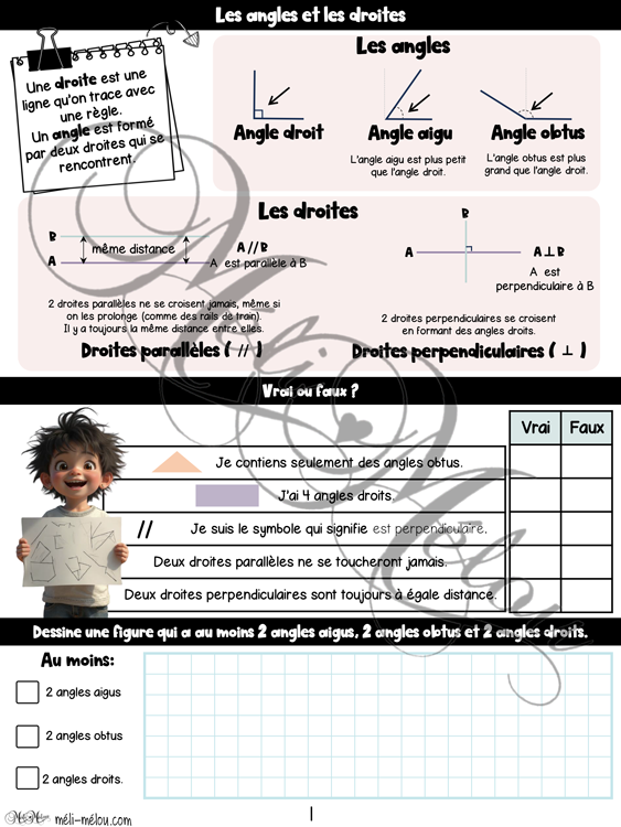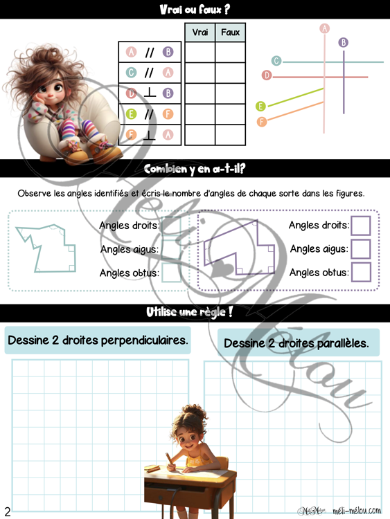 Encadré théorique, exercices et petits problèmes sur les angles et les lignes.