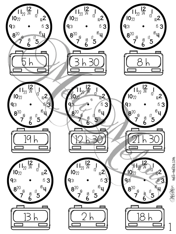 Lire l’heure et l’heure et demie. L’élève doit placer les aiguilles pour indiquer l’heure inscrite ou inscrire l’heure indiquée par les aiguilles.