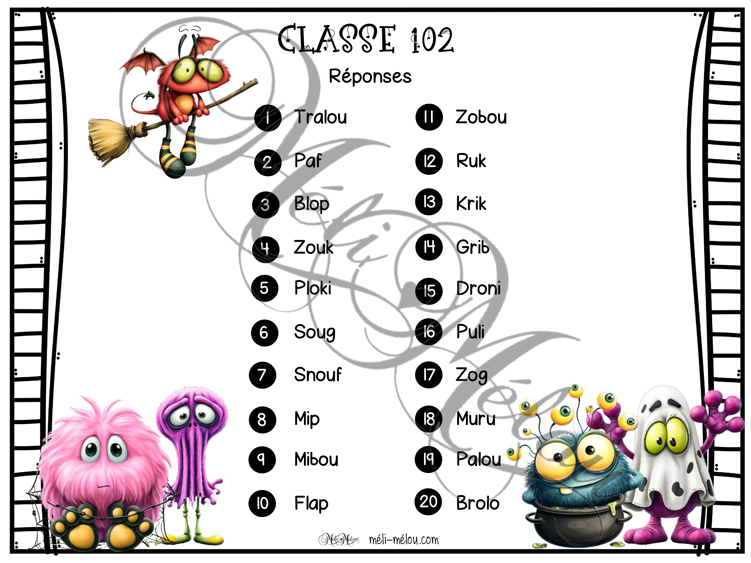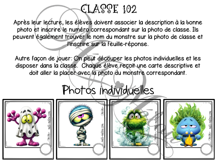 Les élèves doivent lire 20 courts textes descriptifs présentant des petits monstres. Suite à la lecture, ils doivent associer la description à l’un des monstres présents sur la photo de classe. Il y a trois façons d’y répondre: en inscrivant le numéro de chaque monstre correspondant à la description sur la photo de classe, en écrivant le nom du montre sur la feuille-réponse ou en associant la carte descriptive à la photo individuelle. Réponses incluses.