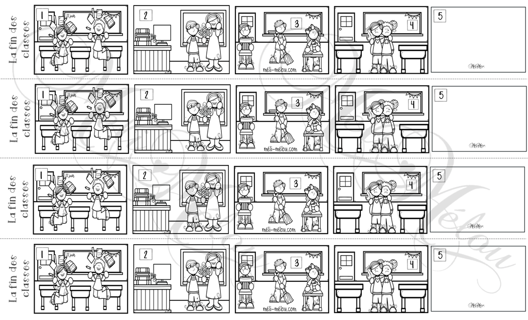 Sur chaque document, il y a 3 ou 4 signets où vous trouverez des histoires séquentielles en 4, 5 ou 6 images. Pour chaque histoire, vous trouverez sur mon site le lexique propre à chaque histoire.